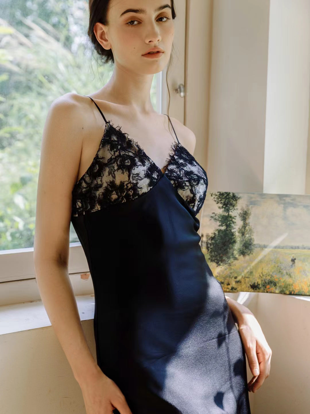 Crafted from lustrous satin and finished with delicate hand-applied lace, the Slip Dress drapes effortlessly over the body. A low back and adjustable straps complete the look—perfect on its own or layered with our matching robe for quiet evening elegance.